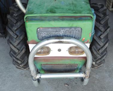 I happened to drive by a place that always has a few items with For Sale signs on them parked out by the road, and saw this. I immediately knew what it was, having seen (and marveled over) one some years back. It was the next day before I got a chance to actually stop and check it out. It's an Italian-made Pasquali 986. Salient features are full articulation, all wheel drive, a 20HP one cylinder diesel engine, 3 point hitch, 2 speed PTO and a 3 range/3 gear drive for a total of 9 forward speeds and 3 reverses. As soon as I showed up and started looking it over, the guy came out, cranked it up and drove it around a bit as a demo. While he was doing so, I was ciphering out the price I'd be willing to pay. When he got back, I asked him straight out what he wanted for it, and his reply was about 2/3rds of the maximum number I had come up with so I didn't even dicker. I just told him I'd be right back with a trailer and the folding money.