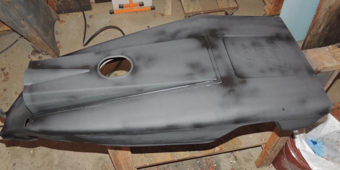 After stripping the paint down to bare metal, I MIG welded the holes shut, ground them down, smoothed them up with a bit of glazing putty and squirted a coat of primer on it. The nose and fenders have gotten the same treatment and all have been shot with a good coat of Allis Chalmers Persian Orange. Why Persian Orange? Because I had a case of it left over from another project.