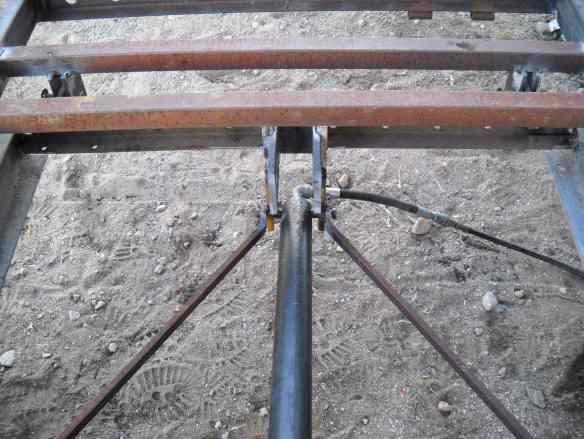 The hinges are made of 1/2" thick 3" wide plate, two on the dump frame straddling one on the subframe, and pinned together with a piece of 1" round stock. The fit is loose enough that I didn't bother to make it a greaseable connection.
