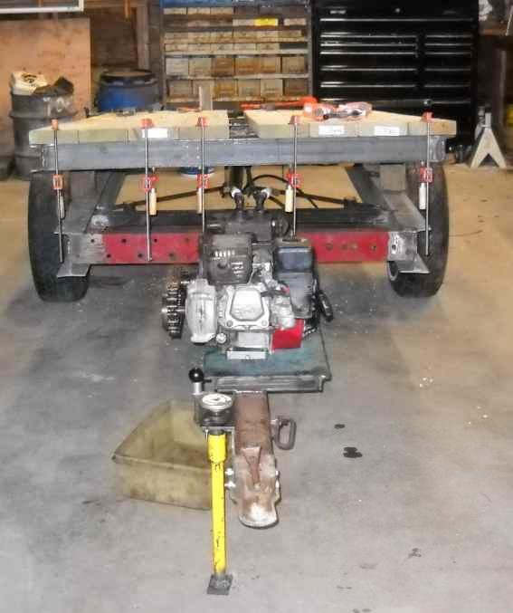 The power pack assembly was cut off the shredder chassis and welded to the tongue of the trailer. A chain guard and a little additional bracing for the mounting plate will be added.