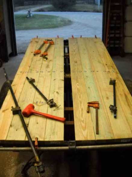 After pricing various options, I decided to deck the trailer with pressure treated 2x6. The planks are captured under a piece of 3x3 angle in the front which is welded to the deck frame. They are carriage-bolted to a crossmember in the middle, and captured under another piece of angle in the rear which is bolted in place. This way, if the deck needs to be replaced, I can unbolt the rear and center and slip them out from under the angle in the front. Fourth cash outlay: 2x6's and galvanized carriage bolts.
