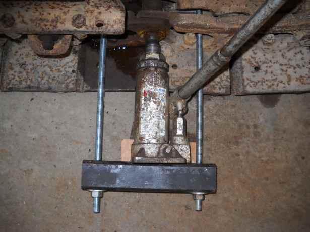 So, I extended the threaded rods and rigged my 20 ton jack. Still no joy, but I'll keep pressure on it, rap it smartly with a BFH occasionally, keep soaking it in weasel piss and perhaps put the torch to it a few more times. It'll come out eventually. I hope...