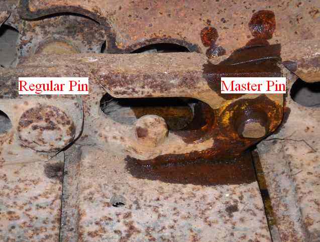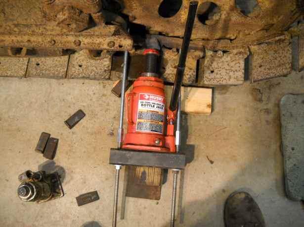 Each track has one master pin that is held in with a circlip (usually missing). The pin can (theoretically) be pressed out and the track removed. Bernie described a jig that will allow me to use a bottle jack to press the pin out. Sure hope it works, NOT looking forward to this fight!