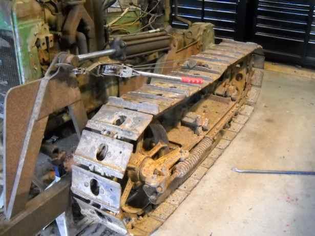 Next step is to get the tracks off. Got the machine up on jack stands with the tracks just clearing the floor and horsed them around with a comealong until the master pin was in a convenient position to press it out.