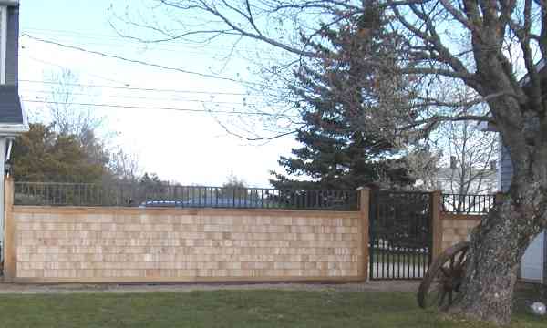 Finally, everything was trimmed with red cedar, finished three sides. It was installed rough side out to match the cedar shingles. The gate is 16 guage 2x2 square tubing frame, with 1x1 square tubing for the center. The top fence is all 1x1 square tubing.
