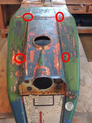 The hood had a number of holes crudely punched into it for reasons best known to the previous owner(s). The four noted by the red circles were probably to bolt an old milk crate or some such to the hood for carrying tools. Or beer. Or both.